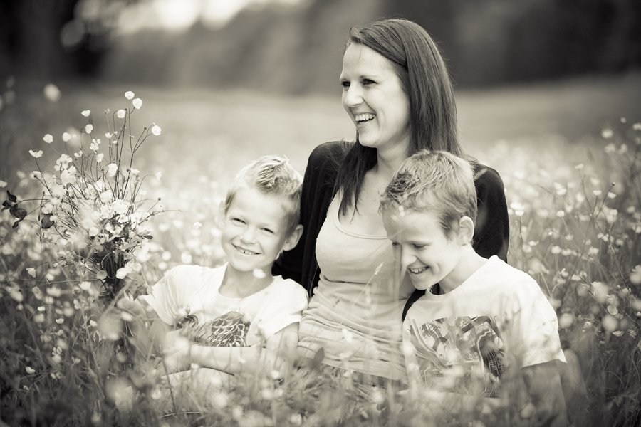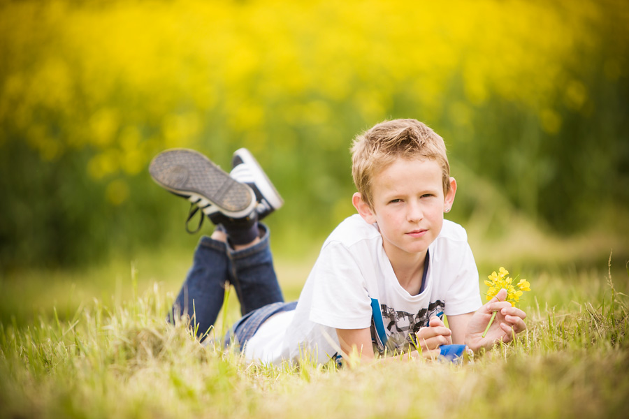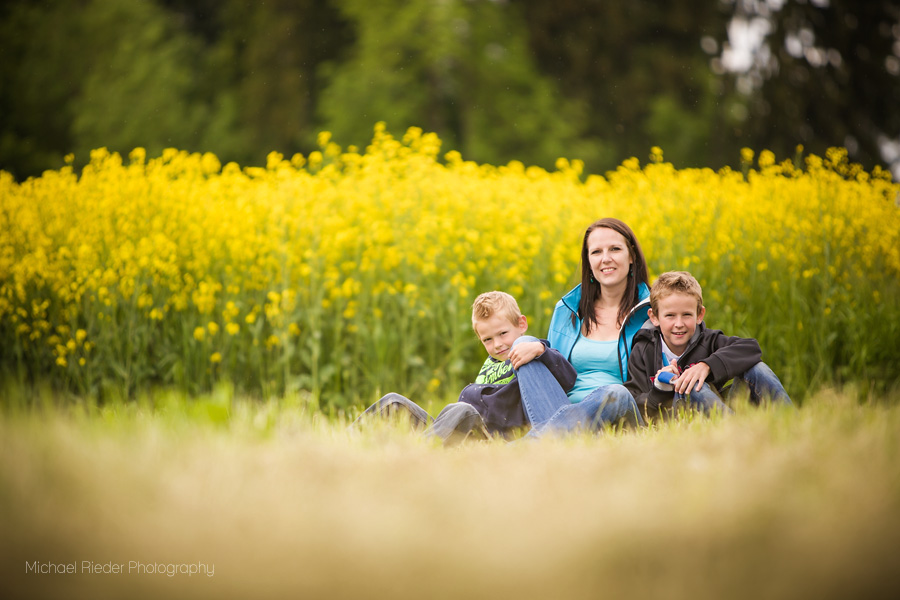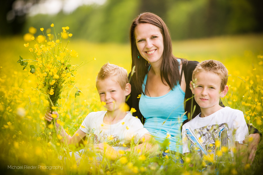 Mit Melanie und ihren beiden Jungs sind wir dann hierher aufgebrochen. Die Location ist praktisch gleich um die Ecke, am Dorfrand gelegen. Der Himmel war ca. 6/8 bedeckt und die Temperatur knapp unter 20°C. Zu Beginn setzten wir uns in die hohe Wiese. Zur Beschäftigung sollten die Jungs doch einen kleinen Blumenstrauss pflücken 🙂 … anschliessend 2-3 weitere, inszenierte „Bildkompositionen“ vorbereitet und jede(n) der Dreien einzeln posieren lassen …