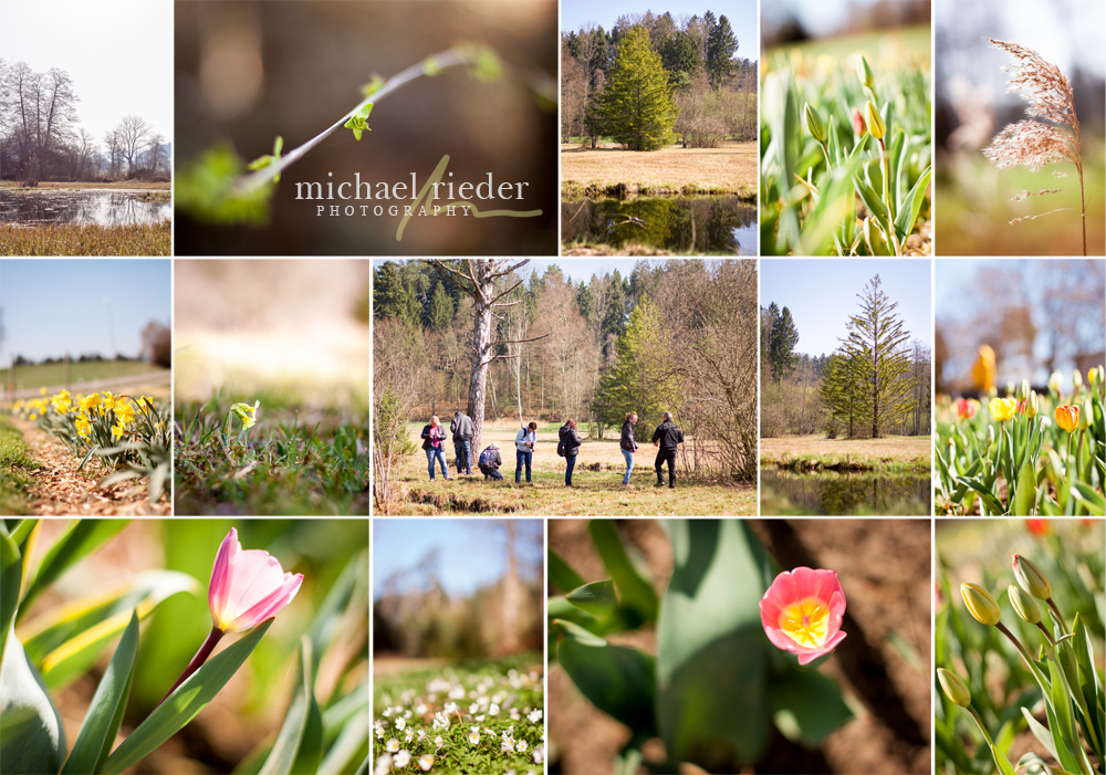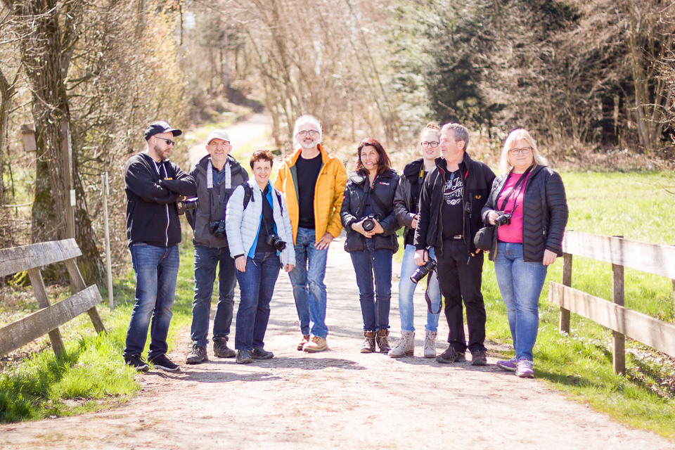 Das beste Rezept für bessere Fotos ist, theoretisches Wissen sofort praktisch umzusetzen. So fanden wir Motive unter freiem Himmel und in Waldabschnitten. Die Natur erwachte gerade. Landschaften und interessante Details gab es einige zu entdecken. Als farbliches Highlight hatten wir Gelegenheit, im Blumenfeld Narzissen und die ersten Tulpen zu fotografieren. Für solche Zwecke nehme ich gerne auch mal einen Falt-Diffusor mit. Gerade bei so schönem Wetter ist das intensive Sonnenlicht manchmal einfach zu „hart“!